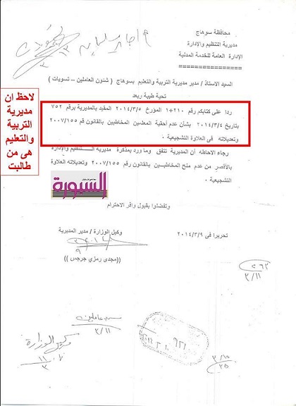 مؤكدا ان هذا القرار يعتبر جرس انذار للمعلمين في جميع المحافظات فهل يستقظ معلمي سوهاج من حالة اللامبالاه