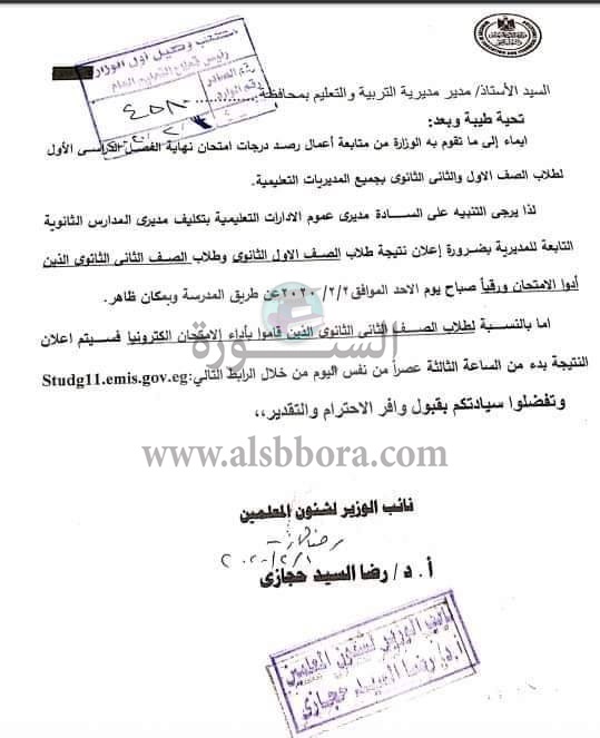 لذا يرجى التنبيه على مديرى عموم الادارات التعليمية بتكليف ميدر ى المدارس التابعة للمديرية بضرورة اعلان نتيجة طلاب الصف الاول الثانوى وطلاب الصف الثانى الثانوى الذين ادوا الامتحان ورقيا صباح يوم الاحد الموافق 2 فبرلاير عن طريق المدرسة وبمكان ظاهر.