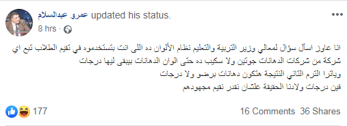 وقال عبدالسلام، عبر صفحتة الرسمية على موقع التواصل الاجتماعى ، فيس بوك،:انا عاوز اسأل سؤال لمعالي وزير التربية والتعليم نظام الألوان ده اللى انت بتستخدموه في تقيم الطلاب تبع اي شركة من شركات الدهانات جوتين ولا سكيب ده حتى الوان الدهانات بيبقى ليها درجات