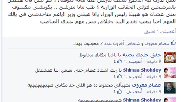 قال عصام معروف معلم علي صفحة خبر عاجل مش عارف ليه الدكتور محلب مارنش عليا لغاية دلوقتى ؟ هو مش قال هيتصل بالمرشحين لتولى الحقائب الوزارية ؟ طب مانا مترشح .. يكونشى مكسوف منى عشان هو هيبقا رئيس الوزراء وانا هبقى وزير !!ياعم متاخدشى فى بالك المهم احنا بنحب نخدم البلد وخلاص مش مهم عندى المناصب