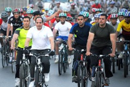 تقدم عبد الفتاح السيسى، رئيس الجمهورية، السباق في يوم رياضى يتضمن ماراثون للدراجات، أقيم من الكلية الحربية وطريق الإسماعيلية، لمسافة 20 كيلو متراً فجر اليوم ، ومعه المهندس إبراهيم محلب رئيس مجلس الوزراء والفريق صبحى صدقى وزير الدفاع، واللواء محمد إبراهيم وزير الداخلية، والمهندس خالد عبد العزيز وزير الشباب والرياضة، وغادة والى وزيرة التضامن الاجتماعى.