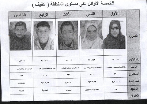 أسماء الأوائل الخمسة المكفوفين، في الشهادة الأبتدائية بمنطقة كفرالشيخ الأزهرية وهم :