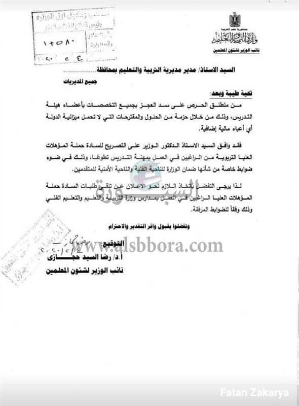 اعلن الدكتور رضا حجازى نائب وزير التربية والتعليم، عن موافقة الدكتور طارق شوقى وزير التربية والتعليم، عن فتح باب التطوع لحملة المؤهلات العليا للعمل بالمدارس وذلك لسد العجز بيم اعضاء هيئة التدريس.