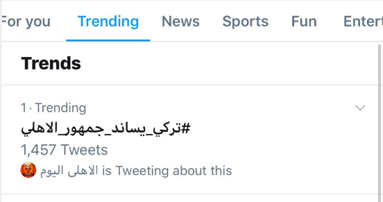 قامت جماهير النادى الأهلى بتقديم الشكر إلى المستشار تركى آل الشيخ، رئيس هيئة الترفيه بالمملكة العربية السعودية، والرئيس الشرفى للنادى الأهلى، حيث تصدر هاشتاج "تركى يساند جمهور الأهلي"، قائمة الأكثر تداولاً على موقع التغريدات تويتر، بعد كشف المنتج الفنى حمادة إسماعيل، أنه قد أعطى تعليمات بعد تعافيه من العملية الجراحية، بتوفير رحلات مجانية لجماهير النادى الأهلى فى مبارياته القادمة بدورى أبطال أفريقيا.