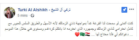 ونشر تركي آل شيخ علي صفحته بموقع التواصل الاجتماعي فيس بوك تدوينه كتب فيها "كنت أتمنى لو سمحت لنا القرعة غداً بمواجهة نادي الزمالك لأنه الأسهل والطريق السلس للعبور مع كامل احترامي لنادي الزمالك وجمهوره الذي احترمه انا باتكلم كرة قدم ومستوى فني خلال هذا الموسم ... دعواتكم لي فأنا محتاج لها".