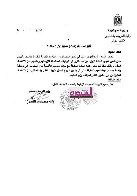 يصدر السادة المحافظون كل فى نطاق تخصصه القرارات اللازمة لنقل المعلمين إلى الوظائف المستحقة ومنح كل منهم بدل الاعتماد اعتبارا من اول الشهر التالى لموافقة وزارة المالية.