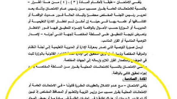 كما تضمن القرار إلغاء الامتحان ـ في الامتحانات العامة أو المحلية ـ بقرار مسبب من وزير التربية والتعليم أو المحافظ إذا تبين أثناء تقدير الدرجات أن هناك تطابقا في إجابات الطلبة في مادةٍ ما أو بعض المواد.