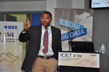 صرح بذلك الدكتور ياسر حجازى عميد الكلية وأضاف أن المؤتمر قد استهل فعليات اعماله بإستضافة العالم المصرى الدكتور هشام هدارة بعقد ندوة شارك فيها الحضور معنونة بـ "مستقبل صناعة الالكترونيات: التحديات والفرص" وأضاف أن الهدف من إقامة هذا المؤتمر هو توفير منبر للباحثين والاكادميين والعلماء ومسئولى القطاع العام والخاص من جميع انحاء العالم لتبادل المعارف والخبرات والتطورات والتطبيقات العلمية خاصة تلك المتعلقة بمجال تكنولوجيا المعلومات التى صمم لها المشاركون منظومة علمية بحثية تطبيقية حوت أحدث البحوث والدراسات فى مختلف أفرع هذا العلم ولاسيما إن منظومة البحث العلمى وتطبيقاته بكامل فروعه يعد الشاغل الاول لإهتمامات الجامعة التى تعول عليه كثيرا فى المساهمة فى تطوير المجتمع المصرى ودعم ركائز التنمية المستدامة الشاملة به.
