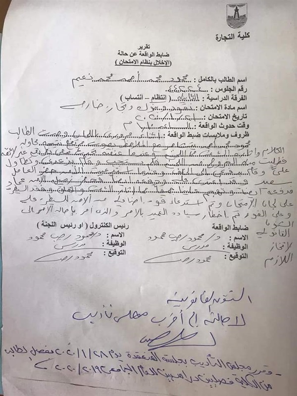يذكر أنه بدأت الواقعة يوم 21 يناير الماضى أثناء امتحانات الكلية، وحسب تقرير أستاذ الجامعة عن حالة الغش والتى تسببت فى فصل الطالب محمود محمد أحمد، حيث أنه أثناء مروره على اللجان وجد صوت مرتفع وشغب من الطالب مع الملاحظ وحديثه بصوت مرتفع وعندما عنفه أستاذ بالجامعة تحدث معه بطريقة غير لائقة فطلب منه الخروج من اللجنة، ولم يستجب وقام بالتطاول على أستاذ الجامعة باليد، وقام بدفعه إلى الخلف وعندما تم استدعاء الأمن حضر أحد العمال وقام الطالب بدفعه وفقد السيطرة على لجنة الامتحان وتم استدعاء قوة إضافية من الأمن للسيطرة على الموقف وتم تحويل الواقعة للشئون القانونية، وبناءًا على ذلك قرر مجلس التأديب فصل الطالب لفصلين دراسيين.