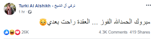 وكتب تركي آل الشيخ عبر صفحته الشخصية بموقع التواصل الاجتماعي " فيس بوك " قائلا " : " مبروك الحمدالله الفوز ... العقدة راحت بعدي ".