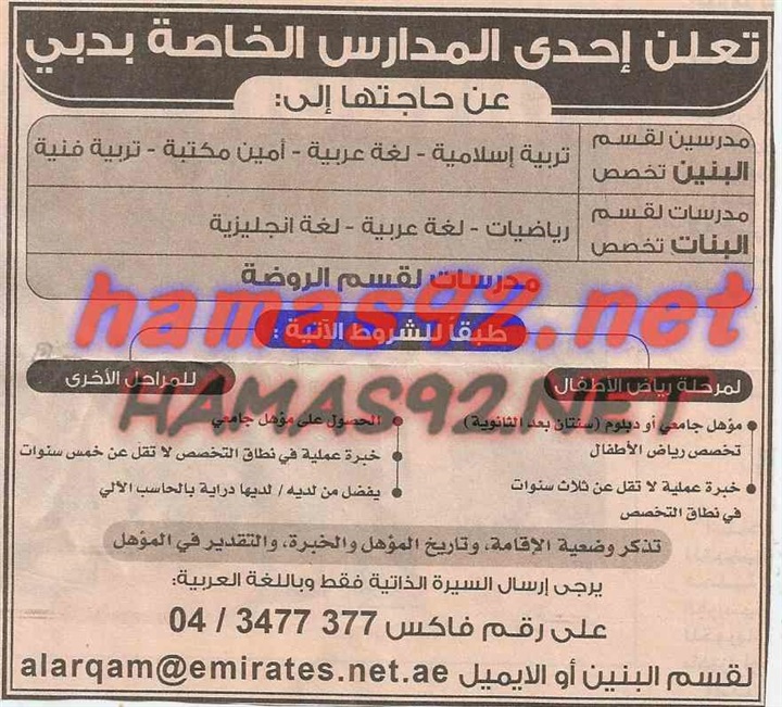 مطلوب لاحدى المدارس الخاصة فى دبى وظائف مدرسين قسم البنين