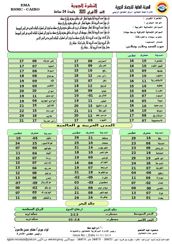 وقال الخبراء إن السواحل الشمالية الشرقية ووسط سيناء تشهد طقس بارد نهارا شديد البرودة ليلا وأمطار متوسطة إلى غزيرة وتنشط الرياح مثيرة للرمال والأتربة وتؤدى إلى اضطراب الملاحة البحرية فى البحر المتوسط، فيما تشهد جنوب سيناء والغردقة طقس مائل للدفء نهارا شديد البرودة ليلا وتنشط الرياح مما يؤدى لاضطراب الملاحة البحرية، فيما يشهد شمال الصعيد طقس مائل للبرودة نهارا شديد البرودة ليلا و غائم أحيانا وتنشط الرياح ، وجنوب الصعيد وحلايب وشلاتين طقس معتدل نهارا شديد البرودة ليلا والرياح نشطة.