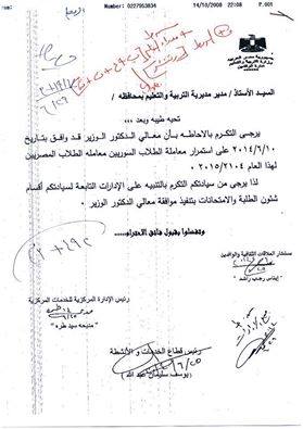 وافق الدكتور محمود ابو النصر وزير التعليم على استمرار معاملة الطلاب السوريين معاملة الطلاب المصريين خلال العام الدراسي 2014/2015