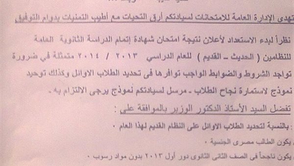 ثالثاً : وفقاً لكتاب الإدارة العامة للإمتحانات ، لجنة الإدارة المركزية والوارد بتاريخ 28/6/2014 بشأن الشروط والضوابط الواجب توافرها فى تحديد الطلاب الأوائل والمتضمن فى البند رقم 2 ما يلى نصه : ( أن يكون ناجحاً فى الصف الثانى الثانوى دور أول 2013 بدون مواد رسوب ) وهو ما يظهر بوضوح أن من شروط إختيار الأوائل الواردة من ديوان عام الوزارة أن يكون الطالب منقول بدون مواد رسوب وهو ما لم يتوافر فى حالة الطالب أحمد رمضان فهمى شعبان وعليه لم يتم إدراجه فى قائمة الأوائل لهذا العام. تلك هى الحقيقة المجردة بلا أية رتوش أو مزايدات نضعها بحكم ضميرنا المهنى أمام الجميع حتى تتضح الصورة بكامل أركانها.