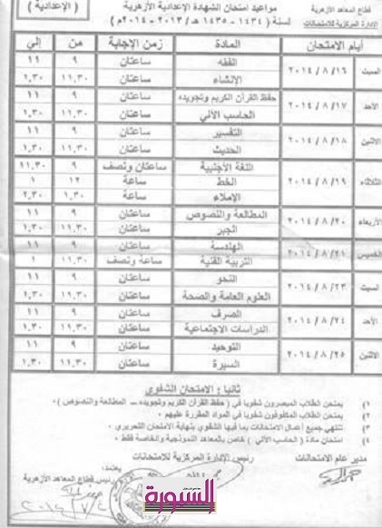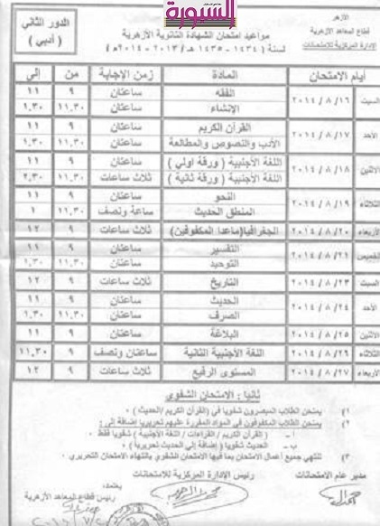 السبورة تنشر جداول امتحانات الدور الثانى للشهادتين الاعدادية والثانوية الازهرية 2013-2014