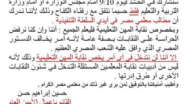 اكد حسين ابراهيم القائم بأعمال الامين العام للنقابة اننا ندرك ان مطالب معلمي مصر في ايدي السلطة التنفيذية ، مشيرا الي انه بخصوص نقابة المهن التعليمية اننا وان كنا نرفض الحراسة علي النقابات بصفة عامة لانه امر يخالف الدستور الذي وافق عليه الشعب الا اننا لن نتدخل في اي امر يخص النقابة لانه ليس من ادبيات نقابة المعلمين المستقلة التدخل في شئون النقابات الاخري