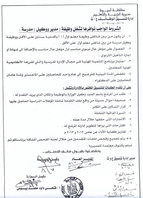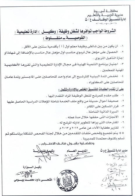 اعلنت مديرية التربية والتعليم بأسيوط عن حاجتها لشغل وظائف قيادية وذلك حتى 30/6/2015 وهي :