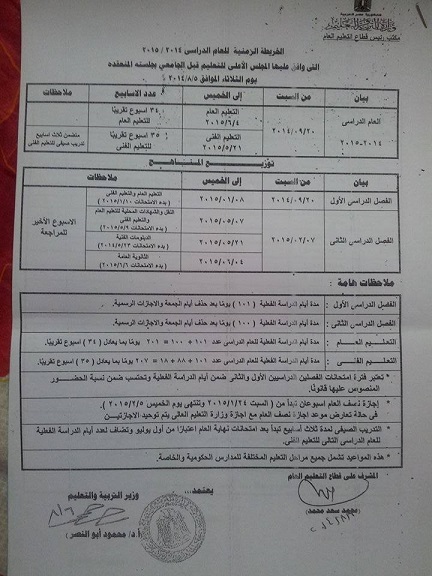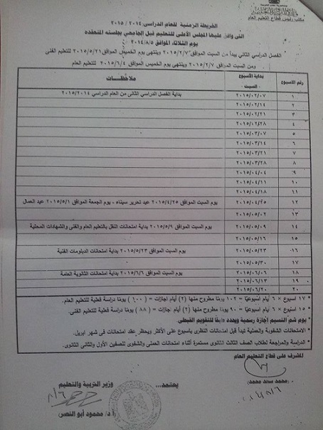 وتبدأ امتحانات النقل بالتعليم العام والفني والشهادات المحلية يوم 2015/5/9، وتبدأ امتحانات الدبلومات الفنية يوم 2015/5/23، وتبدأ امتحانات الثانوية العامة يوم 2015/6/6
