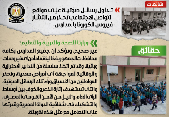تواصل المركز مع وزارتي الصحة والسكان، والتربية والتعليم والتعليم الفني، واللتين شددتا على عدم صحة تلك الأنباء، وأكدت الوزارتان أنه لا صحة لظهور أي حالات مصابة بفيروس كورونا بين طلاب المدارس، وأن جميع المدارس بكافة محافظات الجمهورية خالية تماماً من أي فيروسات وبائية، وأن هناك شفافية كاملة في التعامل مع أى حالات مشتبه بإصابتها بالفيروس، وشددتا على أنه تم اتخاذ سلسلة من التدابير الاحترازية والإجراءات الوقائية لمواجهة أي أمراض معدية، وذلك في إطار حرص الدولة على سلامة وصحة جميع الطلاب من الأمراض والأوبئة.