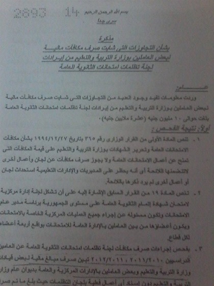 والتقرير مقيد تحت رقم 2893 / 21 "سري جدًا" وتضمن ورود معلومات تفيد وجود العديد من التجاوزات التي شابت صرف مكافآت مالية لبعض العاملين بالوزارة من إيرادات تظلمات الثانوية العامة بلغت 10 ملايين جنيه.