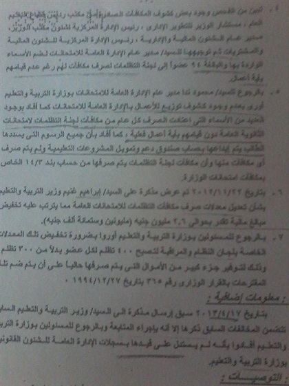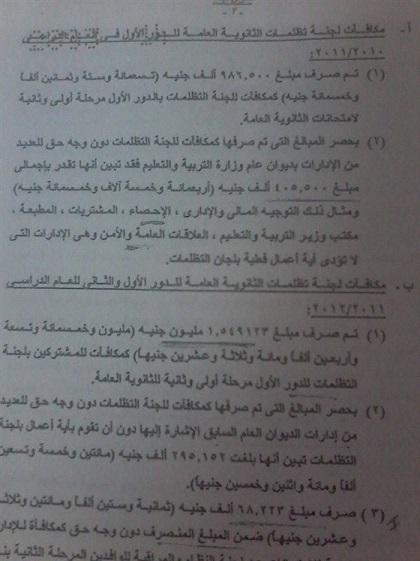 وتضمن تقرير الرقابة الإدارية أنه تم صرف مبلغ 986.5 ألف جنيه مكافآت للجنة التظلمات بالدور الأول مرحلة أولى وثانية لامتحانات الثانوية العامة للعام الدراسي 2010/ 2011، وبحصر المبالغ التي تم صرفها في صورة مكافآت دون وجه حق للعديد من الإدارات بديوان عام وزارة التربية والتعليم، تبين أنها تقدر بإجمالي 405.5 آلاف جنيه للمسئولين بالتوجيه المالي والإداري والإحصاء والمشتريات والمطبعة ومكتب وزير التربية والتعليم والعلاقات العامة والأمن، وهي إدارات لا تؤدي أي أعمال فعلية بلجان التظلمات.