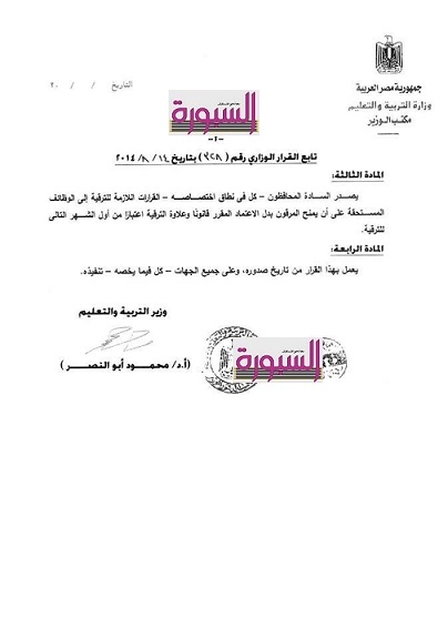 " السبورة "تنشر القرار الوزاري رقم 328 لسنة 2014، والخاص بترقية المعلمين الذين استوفوا شروط الترقية إلى الدرجات الأعلى بعد اجتيازهم التدريبات المقررة.