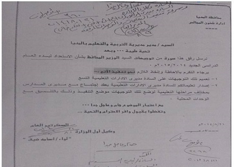 اصدرمحافظة المنيا ومديرية التربية والتعليم بمناسبة بداية العام الدراسى 2014/2015 تعليمات مشددة وذلك بشأن الاستعداد للعام الدراسى الجديد 2015/2014 مع إعطاء التعليمات بتوزيعها على كل الادارات التعليمية و المراحل حتى يتسنى لهم الاطلاع وتنفيذ ماجاء بها من تعليمات مع المتابعة لما يتم تنفيذه بشكل يومى
