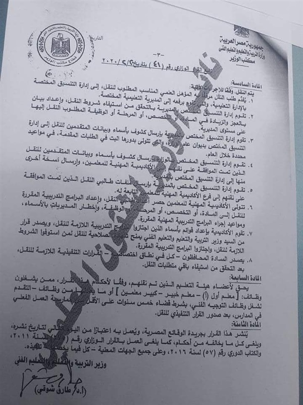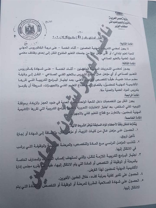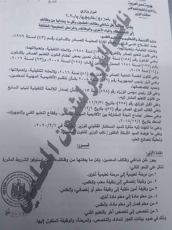 أصدرت وزارة التربية والتعليم والتعليم الفني القرار الوزاري رقم ٤١ لسنة ٢٠٢٠ بشأن ضوابط نقل شاغلي وظائف المعلمين وكل ما يعادلها من وظائف إلى التخصصات والمواد الأخرى والوظائف والمراحل التعليمية المختلفة.