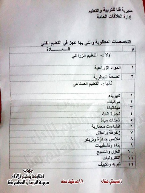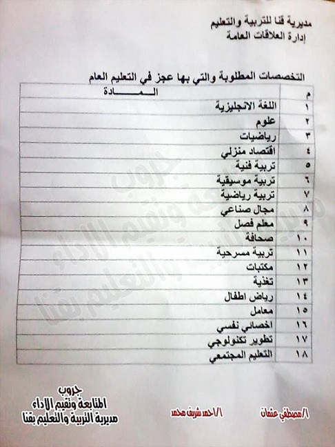 ننشر " التخصصات المطلوبة والتى اعلنت عنها مديرية التربية والتعليم بقنا وتم نشرها في صفحة " المتابعة وتقيم الاداء " عبر موقع التواصل الاجتماعي