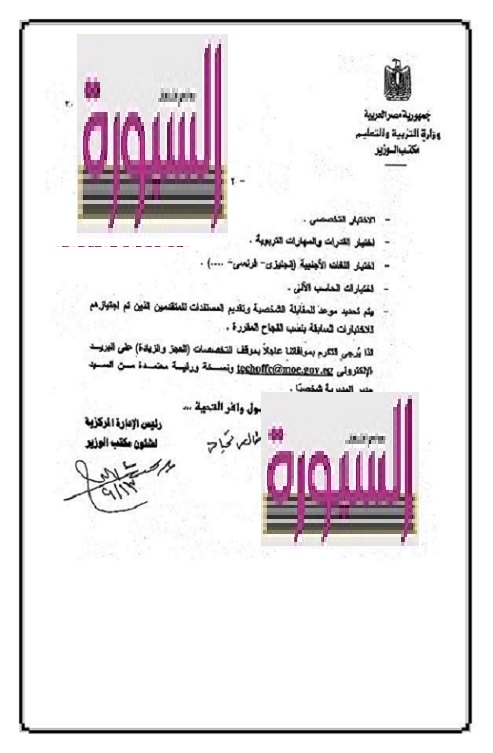 "السبورة " تنفرد بنشرالخطاب المرسل من مكتب الدكتورمحمود ابوالنصر وزير التربية والتعليم والذي حمل عنوان " هام وعاجل" حول بعض التعليمات الجديدة وخريطة مسابقة تعيين "30 الف معلم "