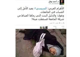 حيث استقطع الصورة وفصل صورة السيدة الملقاة على الأرض وإعادة نشرها باعتبارها طالبة الإسكندرية بهدف تعضيد الإشاعة السابق إطلاقها بتاريخ 14 أكتوبر الجاري لإثارة الرأى العام وتحريض المواطنين ضد أجهزة الشرطة.