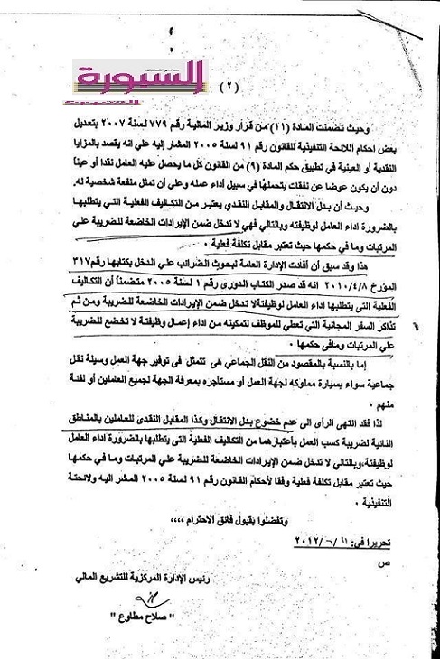 " السبورة " تنشر نص خطاب التشريع المالى بوزارة المالية بخصوص عدم اخضاع بدل الانتقال النقدى الثابت وكذا المقابل النقدى للعاملين بالمناطق النائية لضريبة كسب العمل بتاريخ 11/ 6 / 2012