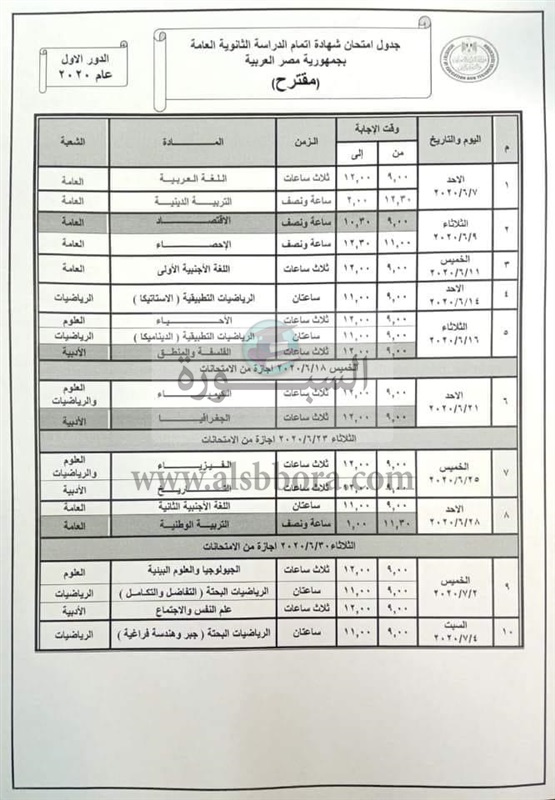 يذكر أن، امتحانات الدور الأول بالثانوية العامة تبدأ 7 يونيو، والدور الثاني 15 أغسطس 2020.