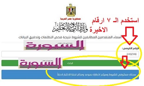 حيث قام فريق عمل "السبورة " بتجربة بسيطة بأدخال الـ "7 " أرقام الأخيرة من الرقم القومي لاحد المتقدمين وكانت المفاجأة لنفس الرقم أمام البحث ( سجلك مستوفي للشروط وسيتم اخطارك بموعد ومكان لجنة الاختبار لاحقاً) كما هو موضح بالصور المرفقة