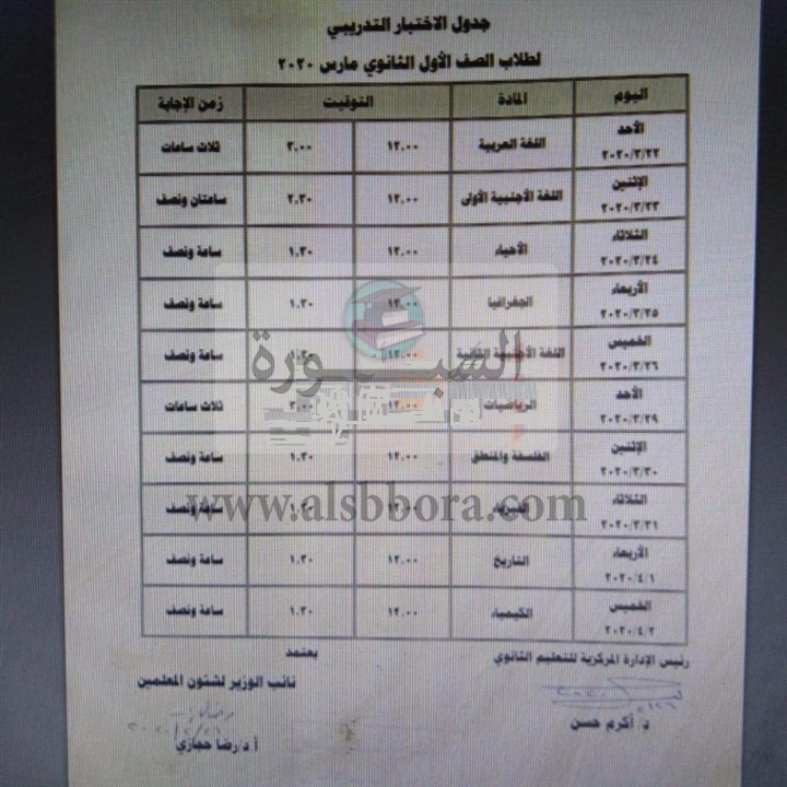 اعلنت وزارة التربية والتعليم والتعليم الفنى، عن جدول امتحانات دور مارس 2020، لطلاب الصف الاول الثانوى الكترونيا.