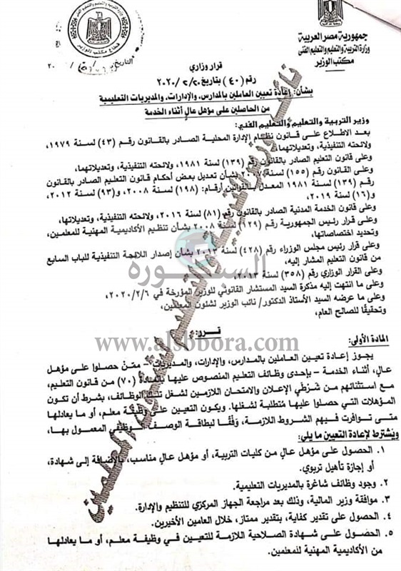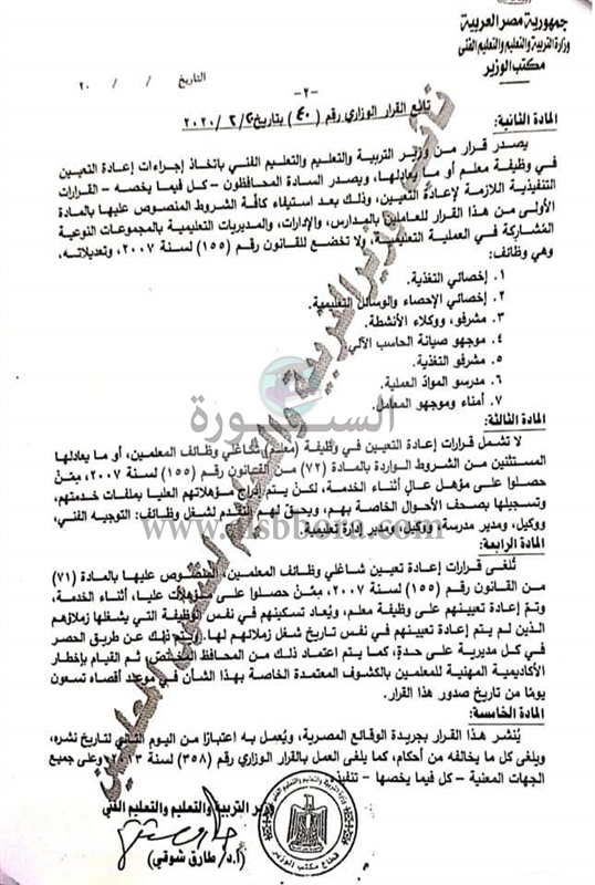 وزارة التربية والتعليم والتعليم الفني قرارا وزاريا، بشأن إعادة تعيين