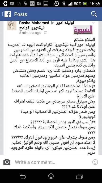 و يستنكرأولياء الأمور ما يحدث بالمدرسة و أن اولادهم لحاجة لمدرسى الأنشطة التى تنمى مهارتهم وقدراتهم سواء فنييه او رياضيهو كذلك فى حاجة ماسة للمشرفين نظرا للحوادث المتكررة بالمدارس هذه الايام