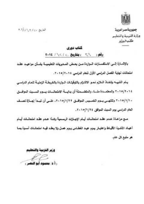 وتم التنبية باتخاذ اللازم نحو الالتزام بالتوقيتات الواردة بالخريطة الزمنية للعام الدراسى 2015/2014 والمعتمدة منا والمتضمنة ان بداية الامتحانات يوم السبت الموافق 10/1/2015 وتنتهى يوم الخميس الموافق 22/1/2015 على ان تبدأ اجازة نصف العام الدراسى يوم 24/1/2015