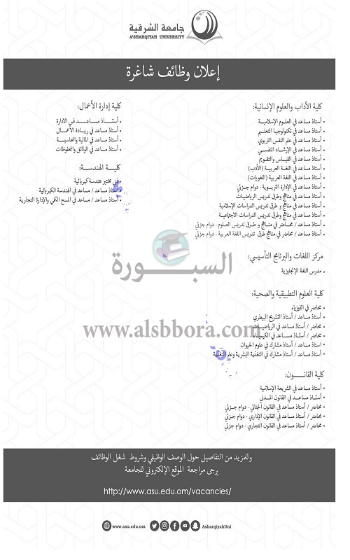 تعلن جامعة الشرقية بسلطنة عمان عن حاجتها الى اعضاء هيئة التدريس ومعاونيهم، وعلى الراغبين فى الحصول على الوظيفة الدخول على موقع الجامعة عبر شبكة الانترنت، ولمزيد من التفاصيل عبر الاعلان التالى: