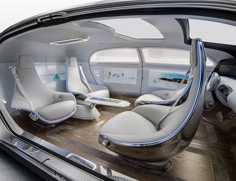 وتفتح السيارة إف- 015 الفاخرة ذات الكابينة الواسعة، التي تضم ما يشبه غرفة جلوس لأربعة أشخاص فرصا جديدة في صناعة السيارات التي تُقاد آليا إذ يمكن أن تتحول إلى غرف جلوس فعلية تسير على عجلات.