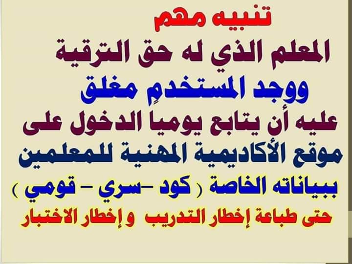 وجهت الاكاديمية المهنية للمعلمين تنبيها مهما الى جميع المعلمين المرشحين للترقى والذين وجدوا المستخدم مغلق عليهم ان يتابعون يوميا الدخول على موقع الاكاديمية ببياناتهم الخاصة "كود - سرى - قومى" حتى طباعة اخطار التدريب واخطار الاختبار.