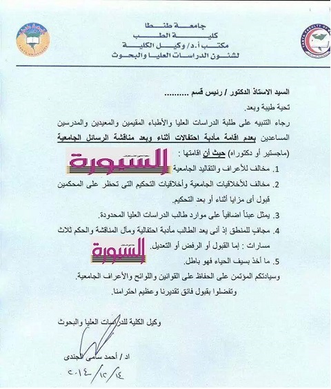صدر قرار من الدكتور احمد سامي الجندي وكيل كلية الطب بجامعة طنطا للدراسات العليا قبل ان ينتهي عام 2014 وبالتحديد في 14 ديسمبر 2014 ، حمل هذا القرار معاني كثيرة لاستخدام روح القوانين للصالح العام واعطي درسا للوزير وقياداته في الجامعات ،وللاسف الشديد مر مرور الكرام امام الجميع ،ولم يتوقف البعض عنده ولو للحظة