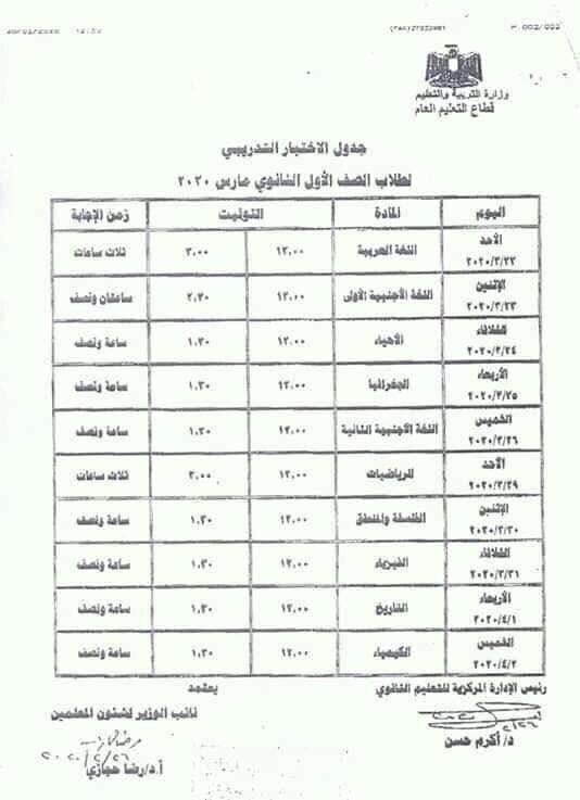 وبحسب الجدول يؤدى طلاب الصف الأول الثانوى العام امتحاناتهم إلكترونيا يوم 22 مارس فى مادة اللغة العربية ويوم 23 فى مادة اللغة الأجنبية الأولى و24 فى الاحياء و25 فى الجغرافيا و26 فى اللغة الأجنبية الثانية و29 فى الرياضيات و30 فى الفلسفة والمنطق و21 الفيزياء و1 ابريل التاريخ و2 أبريل الكيمياء.