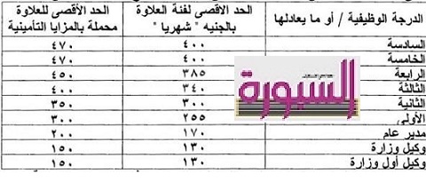 وتطبيقا لقانون الحد الأدنى للأجور فإن متوسط الأجر الشامل للموظفين بعد تطبيق الحد الأدنى للأجور كالتالي: الدرجة السادسة 1201 جنيه، وللخامسة 1215 جنيه، وللرابعة 1222 جنيه وللثالثة 1308 جنيهات، وللثانية 1705 جنيه والدرجة الأولى 2035 جنيه، ولدرجة مدير عام 2391 جنيه، والدرجة العالية 2569 جنيه، والدرجة الممتازة 3740 جنيه.