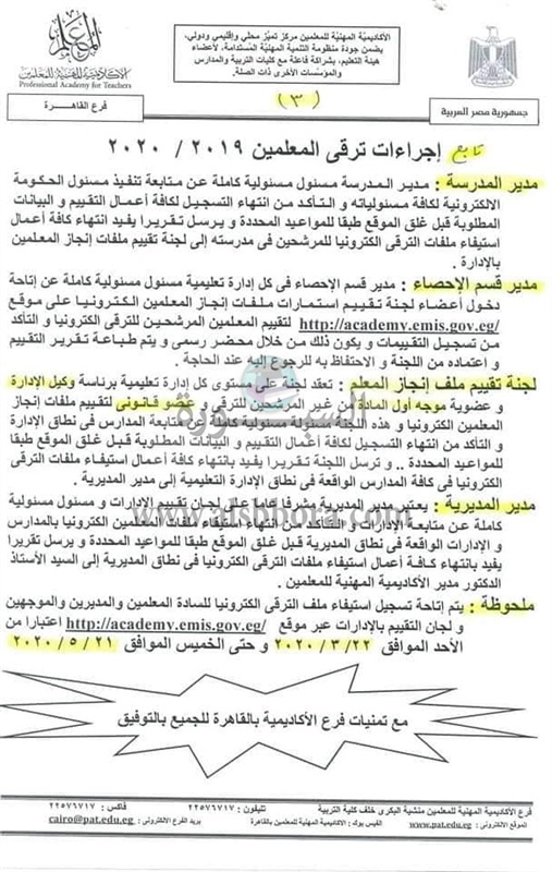 واضافت فى بيان لها انه يتم اتاحة تسجيل استيفاء ملف الترقى الكترونيا للمعلمين والمديرين والموجهين ولجان التقييم بالادارات عبر الموقع الالكترونى اعتبارا من يوم الاحد الموافق 22 مارس وحتى الخميس الموافق 21 مايو 2020.