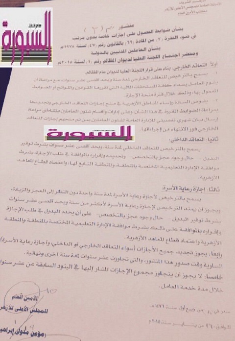 اصدر المجلس الاعلى للازهر منشور يحمل رقم 3 لسنة 2015 بشان اعادة الضوابط بخصوص منح الاجازات للعاملين بالخارج والداخل والتى حددها المجلس بعشر سنوات فقط للجميع ،،