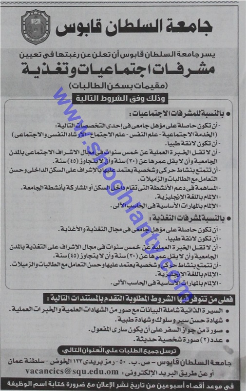 وظيفتك عندنا جامعة السلطان قابوس تعلن عن وظائف شاغرة الإثنين 19/يناير/2015 - 08:49 م facebook twitter whats x facebook twitter rss feed جامعة السلطان قابوس تعلن عن وظائف شاغرة facebook twitter whats