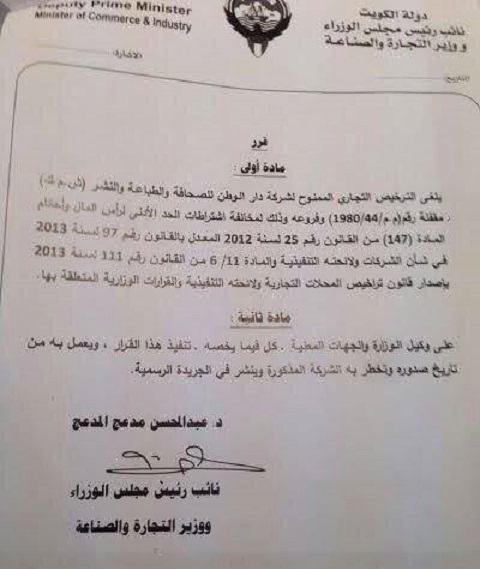 لاسباب قانونية وبتوقيع نائب رئيس الوزراء الكويتي ، تم الغاء ترخيص جريدة الوطن الكوبتبة ، وايقافها ، ولن تصدر اعتبارا اليوم 20 يناير 2015