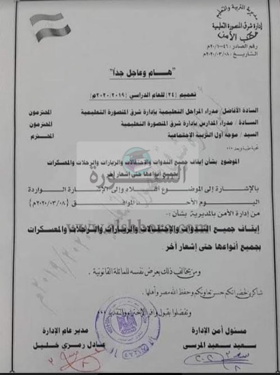 تعليم الدقهليه تعلق جميع الندوات والاحتفالات والرحلات النيلينه بسبب كورونا ..مستند
