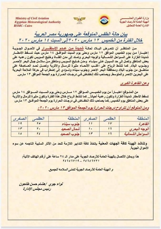 جدد محمود شاهين مدير مركز التحاليل والتنبؤات الجوية، تحذير هيئة الأرصاد الجوية من التقلبات الجوية التى تشهدها البلاد بدءا من مساء يوم الخميس المقبل وتهدأ نسبيا يوم السبت.
